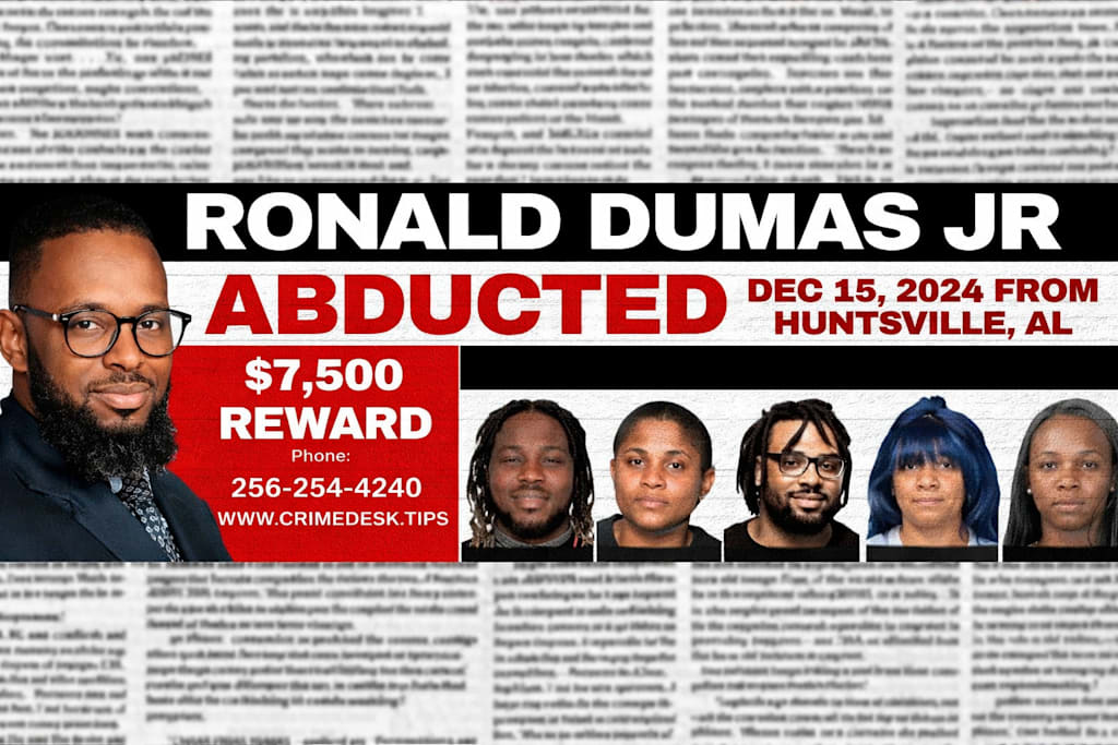 Ronald Dumas Jr., a Huntsville real estate agent and father of three, disappeared on December 15, 2024, after being seen on surveillance footage with two women at a liquor store on University Drive.