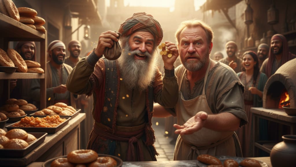 A crowd began to gather, as people loved to watch an argument in the marketplace. The beggar tried to explain that steam has no price, but the baker wouldn't let go. Just then, Bahlool happened to be walking by. Everyone in Baghdad knew Bahlool—some thought he was a madman, but others knew he was the wisest person in the city. Seeing the commotion, the Arab beggar turned to Bahlool and asked him to settle the dispute.