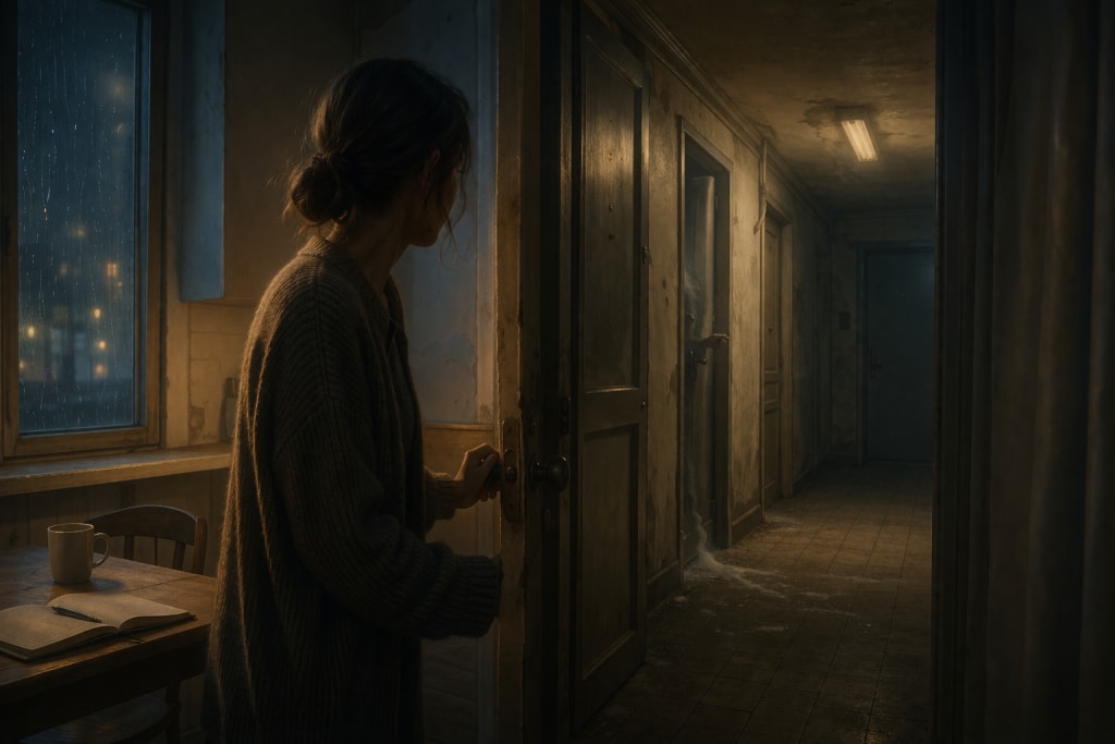 A dull yellow light flickered above the stairwell. Three doors lined the corridor: hers, the empty unit across from it, and the one at the far end where Mr. Okada had lived before he moved away last winter.