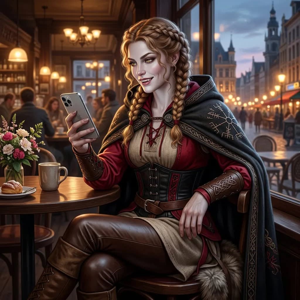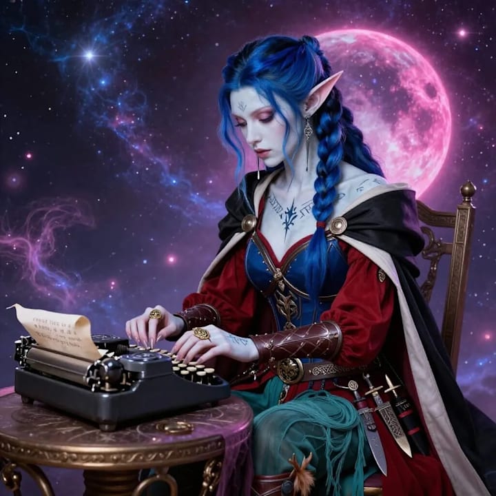 Her titles are a deep reflection of her being: High-Ranking Pink-Blood-Moon Elf ears, Druid Demi-Princess, Germanic-Native-Viking Assassin, and a Tribrid Lycan Alpha Red-Wolf who can illuminate ancient runes on her tribal arm, her porcelain skin complemented by a cursed gold ring with the Lycan crest, signifying her as a Wolf/Vampiress/Shadow-Storm Witch.