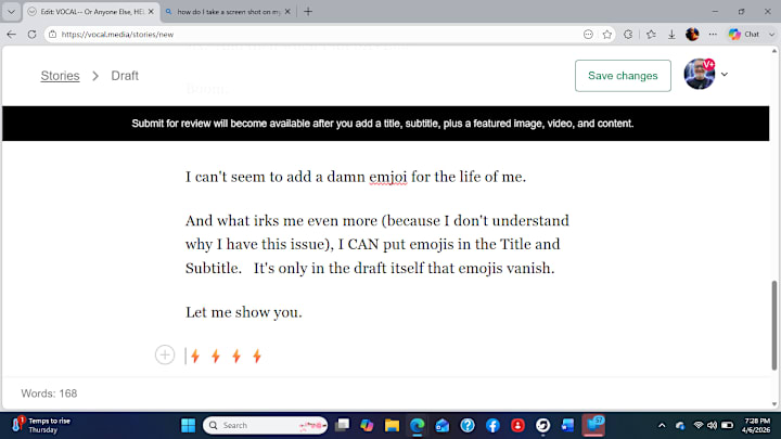 And what irks me even more (because I don't understand why this happens), I CAN put emojis in the Title and Subtitle. (As witnessed both my title here and in my cover pic.)