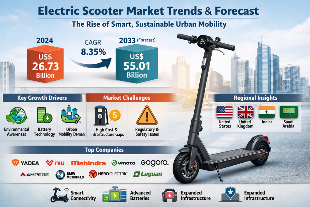 According to recent insights, the global electric scooter market was valued at US$ 26.73 billion in 2024 and is projected to reach US$ 55.01 billion by 2033, expanding at a compound annual growth rate (CAGR) of 8.35% between 2025 and 2033 . This steady growth reflects not only rising consumer demand but also strong institutional support and ongoing advancements in battery and mobility technologies.