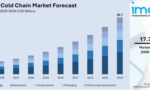 Mexico Cold Chain Market: Growth and Forecast (2026–2034) The Mexico cold chain market is entering a high-growth phase, supported by structural shifts in food consumption, healthcare logistics, and cross-border trade. The market reached a value of USD 5.7 Billion in 2025 and is projected to expand significantly to USD 25.7 Billion by 2034, growing at a CAGR of 17.78% during 2026–2034. This strong growth trajectory reflects the increasing need for reliable temperature-controlled infrastructure across multiple industries.